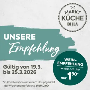 Mit dem Abenddeal erhalten Sie in der BILLA Marktküche von Montag bis Freitag ab 16 Uhr jeden Tag ausgewählte Gerichte zum unschlagbaren Preis. Entdecken Sie unsere Wochenvorschau!