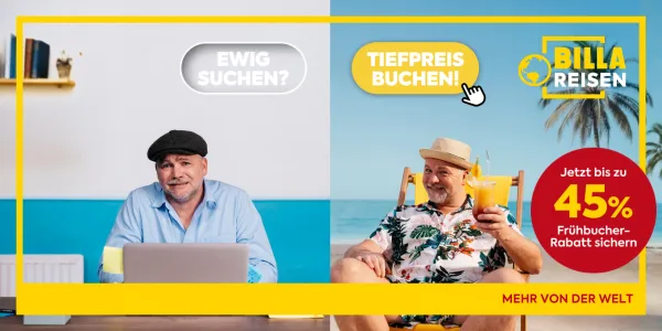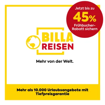 Bei BILLA Reisen sichern Sie sich jetzt bis zu -45% Frühbucher-Rabatt inklusive Tiefpreisgarantie¹ auf Ihren nächsten Sommerurlaub.