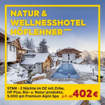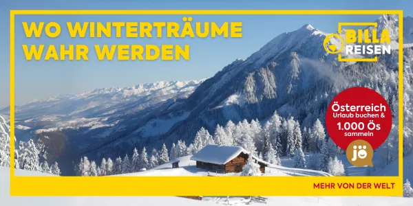 Mit Ihrer Buchung bis 31.10.2025 bei BILLA Reisen profitieren Sie von den Angeboten, die Ihren Wintertraum von Österreichurlaub wahr werden lassen, und Sie sammeln auch 1.000 Ös - also doppelt so viele Ös wie sonst.