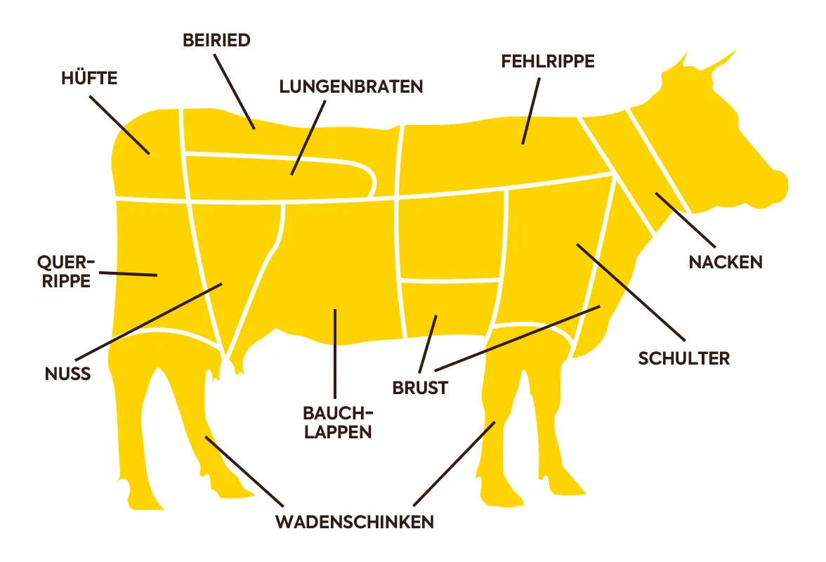 Grobfasrig und durchzogen. Verwendet für Gulasch, Suppe oder Faschiertes.