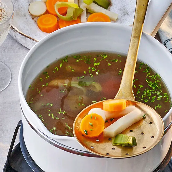Je nach Größe des Topfes benötigt man 1 ½ bis 2 ½ Liter Suppe oder Öl (Sonnenblumenöl oder Rapsöl).