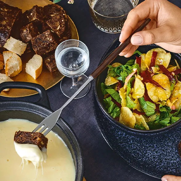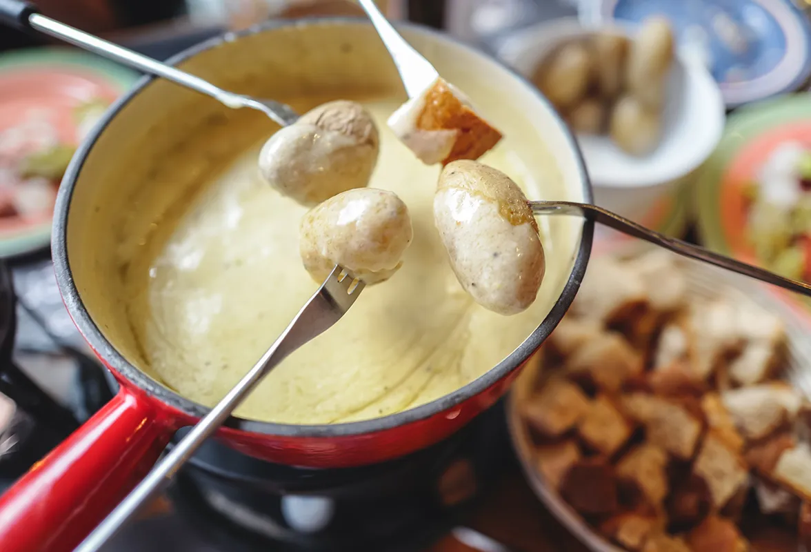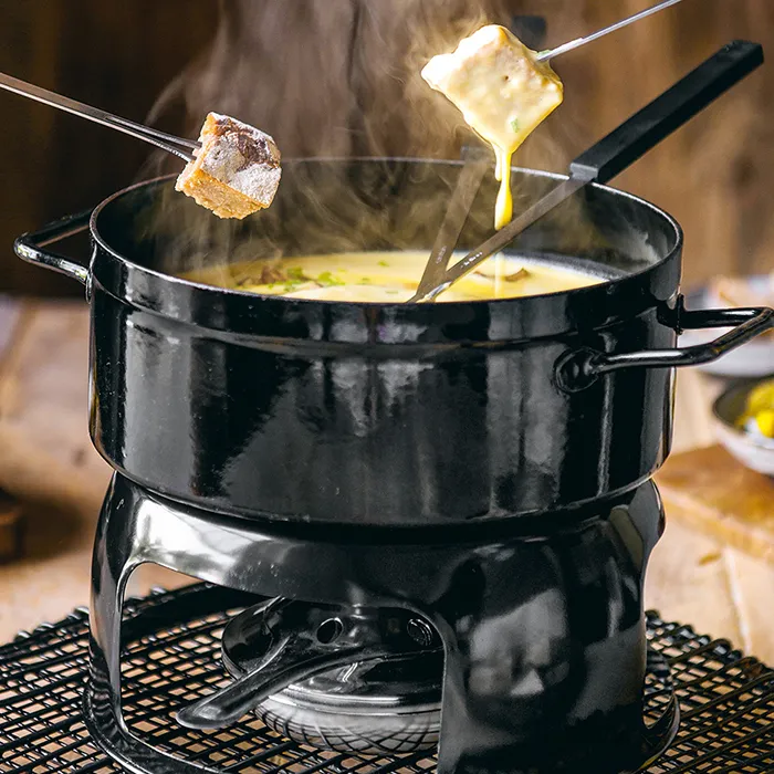 „Fondue” kommt aus dem Französischen und heißt übersetzt „geschmolzen”, doch der Name ist nicht immer Programm. Während Käse-Fondue ihm alle Ehre macht, gibt es auch Zubereitungsarten, in denen rohe Zutaten in Brühe oder Fett gegart werden.