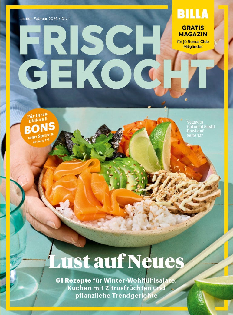 Das aktuelle FRISCH GEKOCHT-Magazin gibt es jetzt GRATIS* für jö Bonus Club Mitglieder bei BILLA, BILLA PLUS und in BILLA Kaufleute Märkten und hier Online zum Durchblättern.