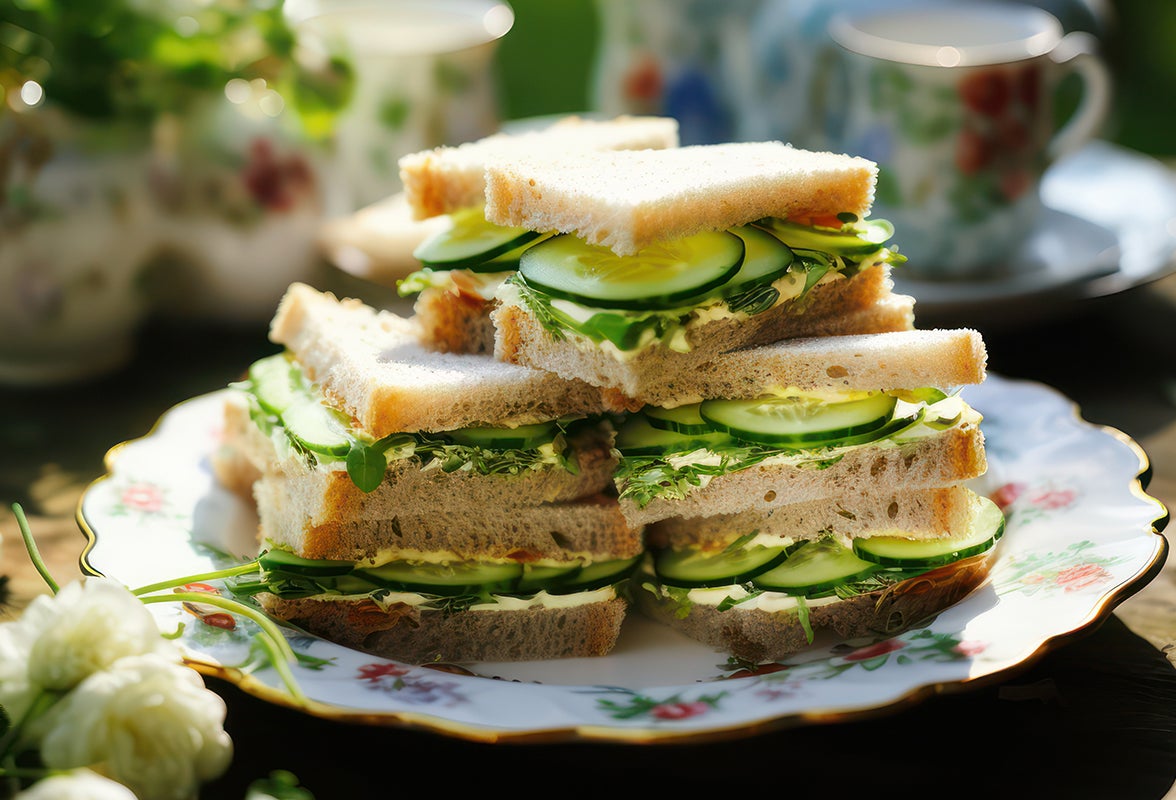 Da darf das klassische Gurkensandwich nicht fehlen. Dafür zwei Scheiben Weißbrot oder Toast (ohne Rinde) mit Butter bestreichen. Dünne Gurkenscheiben auf das Brot legen und mit etwas Salz und Pfeffer würzen. Das Brot diagonal in Dreiecke schneiden und servieren.