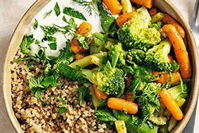 2. Quinoa richtig zubereiten: Nach dem Waschen im Verhältnis 3:1 (Wasser zu Quinoa) mit einer Prise Salz 15 Minuten bei geschlossenem Deckel köcheln lassen. Restliche Flüssigkeit abgießen und Quinoa abtropfen lassen.