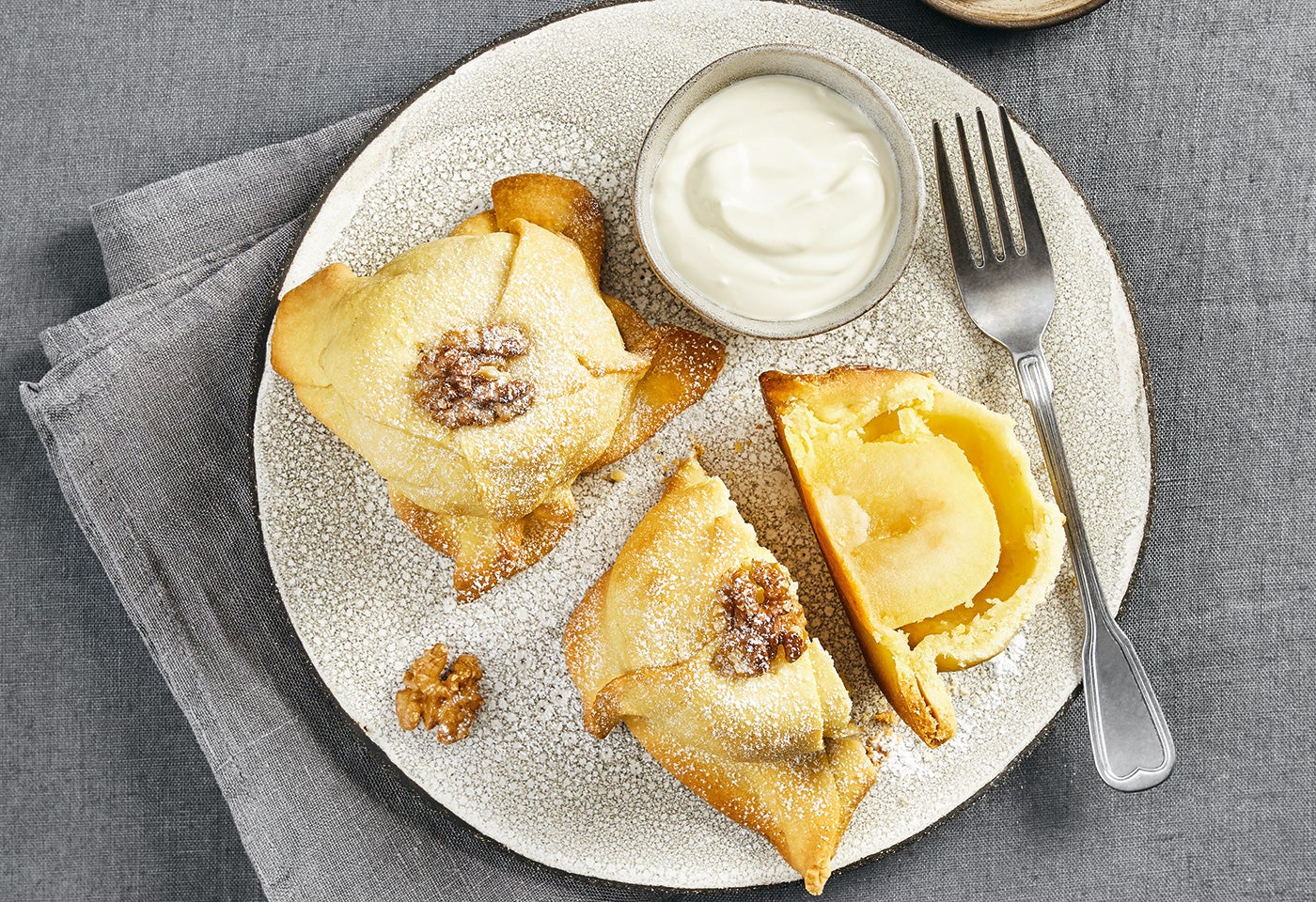 Backrohr auf 160 °C (Ober-/Unterhitze) vorheizen. Äpfel schälen und die Kerngehäuse ausstechen. Den Teig auf einer bemehlten Arbeitsfläche quadratisch ausrollen und in 4 Quadrate schneiden. Jeweils einen Apfel daraufsetzen und die Teigecken über dem Apfel zusammenschlagen. Je 1 Walnuss daraufdrücken. Auf mittlerer Schiene ca. 15 Minuten goldbraun backen.