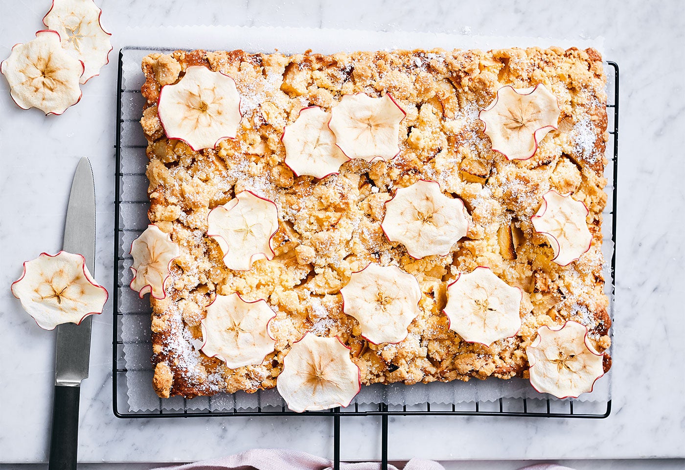 Kuchen anrichten, mit Staubzucker bestreuen, mit Apfelchips belegen und servieren.