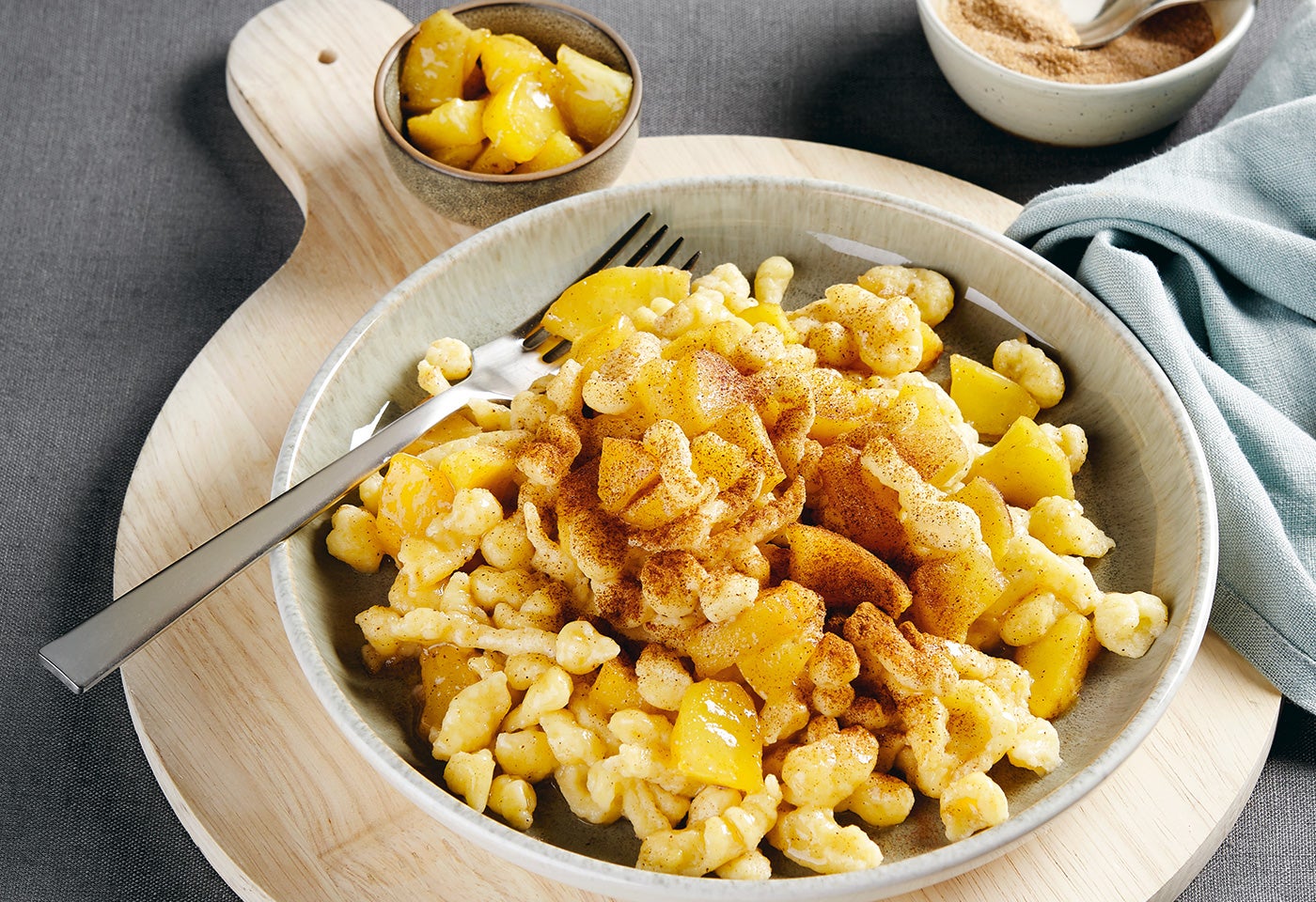 Spätzle mit den Äpfeln vermischen und anrichten. Mit dem restlichen Zimt (½ TL) bestreuen und servieren.