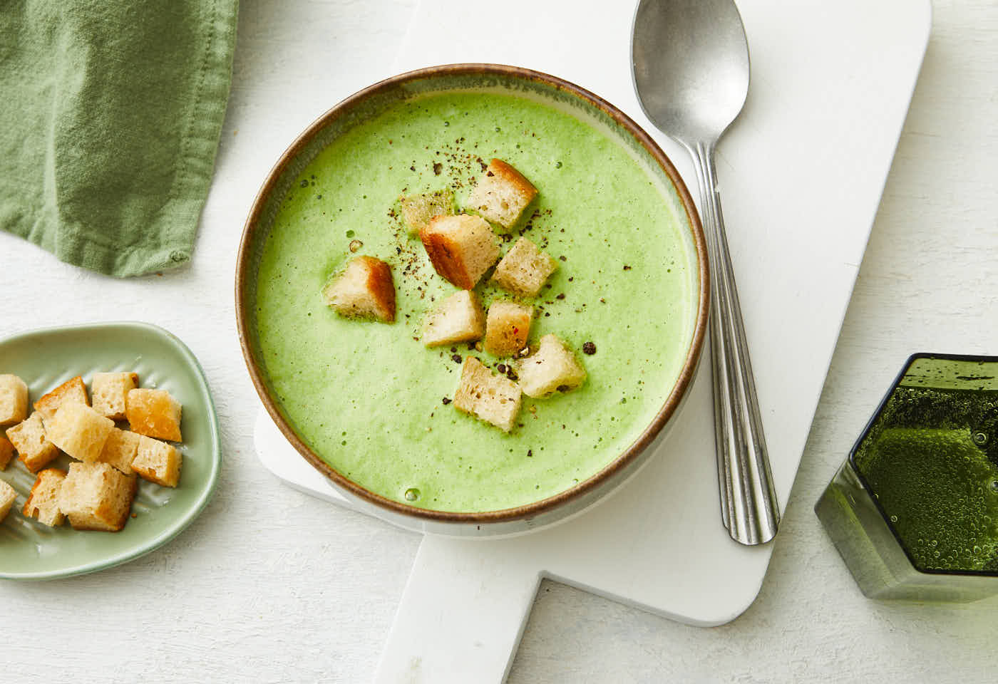 Zutaten für remove add Portion(en)1 Zwiebel1 Knoblauchzehe2 ELButter500 mlGemüsebrühe100 mlSchlagobers100 gBärlauch2 ScheibenWeißbrot1 PriseMuskatnuss, gemahlen Salz Pfeffer a. d. MühleZubereiten