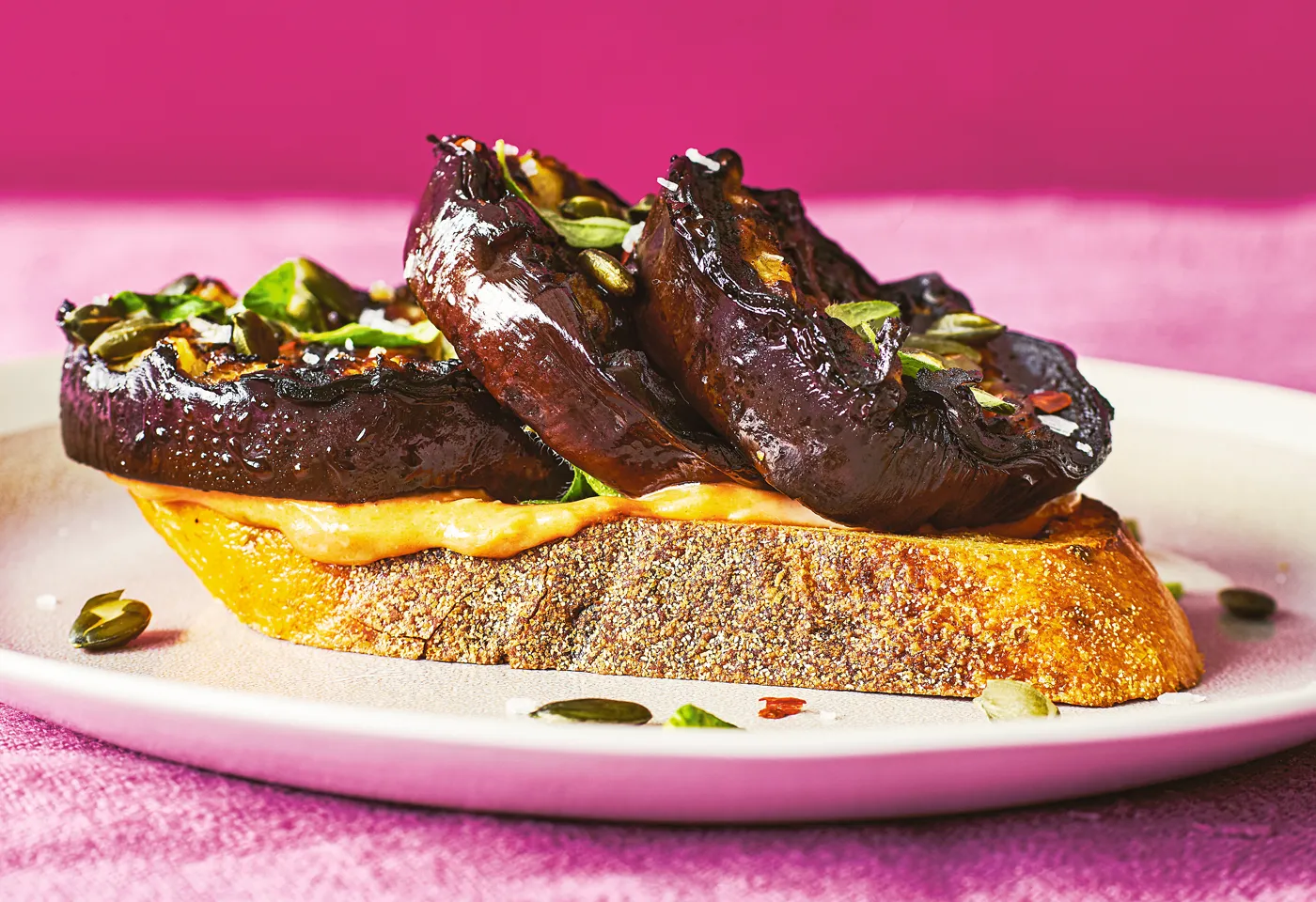 Balsamico-Melanzani mit Kürbiskernen auf Chilibrot