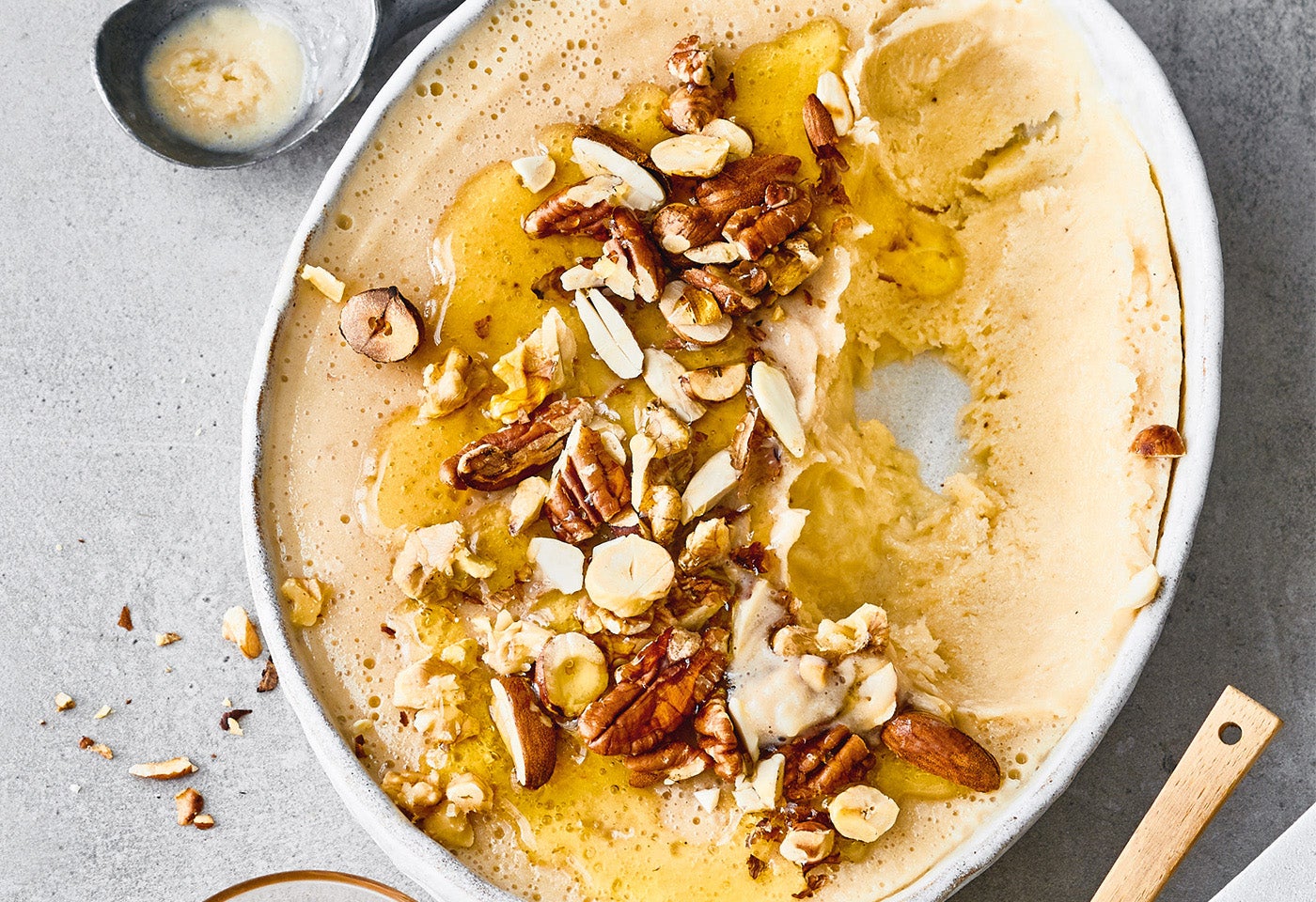 Eis mit Nüssen bestreuen, mit dem restlichen Honig (80 g) beträufeln und servieren.