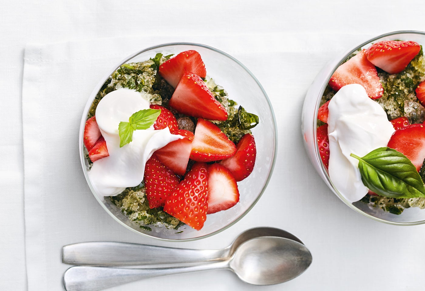 1accessibility.recipes.cookingstepErdbeeren putzen und halbieren oder vierteln. Ein paar Basilikumblätter zum Garnieren beiseitelegen, den Rest grob hacken.2accessibility.recipes.cookingstepGehacktes Basilikum, die Eiswürfel und den Agavendicksaft in einem Hochleistungsmixer mixen, bis die Eiswürfel zu feinen Splittern zermahlen sind.3accessibility.recipes.cookingstepBasilikum-Granita in Schüsseln füllen und die Erdbeeren darauf anrichten. Je 2 EL Joghurt daraufgeben, mit Basilikum garnieren und servieren.