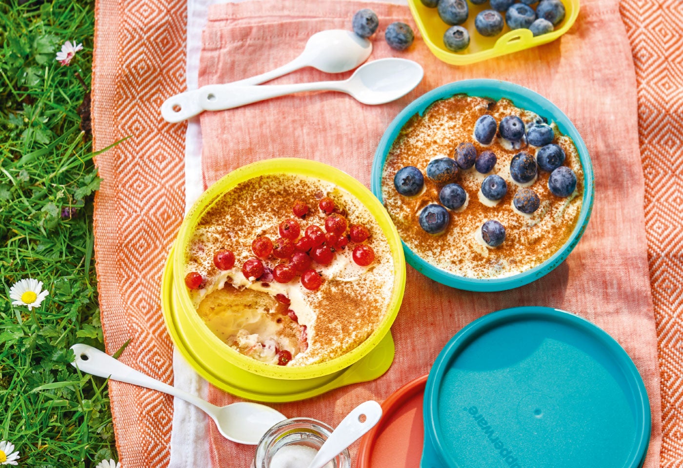 Tiramisu mit Zimt bestreuen und die Schüsseln zum Transportieren verschließen. Restliche Beeren (je ca. 65 g Ribiseln und Himbeeren, ca. 40 g Heidelbeeren) beim Picknick auf das Tiramisu legen oder dazu servieren.