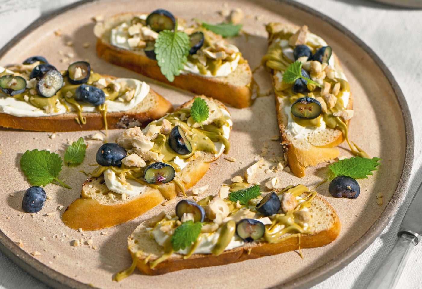 Striezelscheiben mit Frischkäse bestreichen, Pistaziencreme und Kokos-Cashews darübergeben. Mit Heidelbeeren und Zitronenmelisse garnieren.