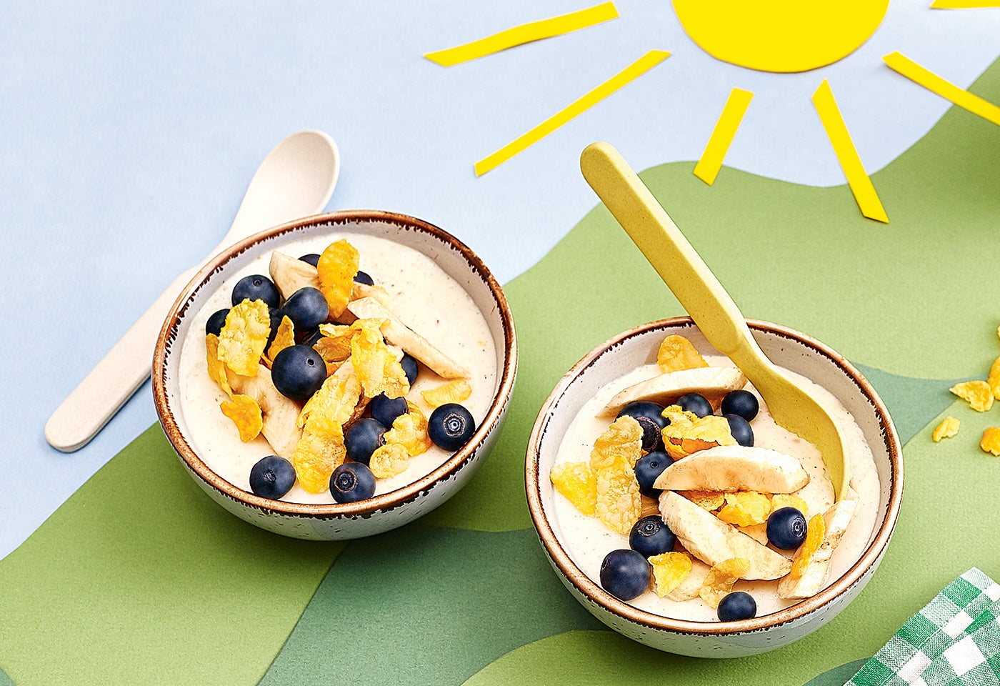 Schäle die Banane, halbiere sie der Länge nach und schneide sie in Scheiben. Verteile die Bananenscheiben mit den Heidelbeeren und den zur Seite gestellten Cornflakes auf den Puddings.