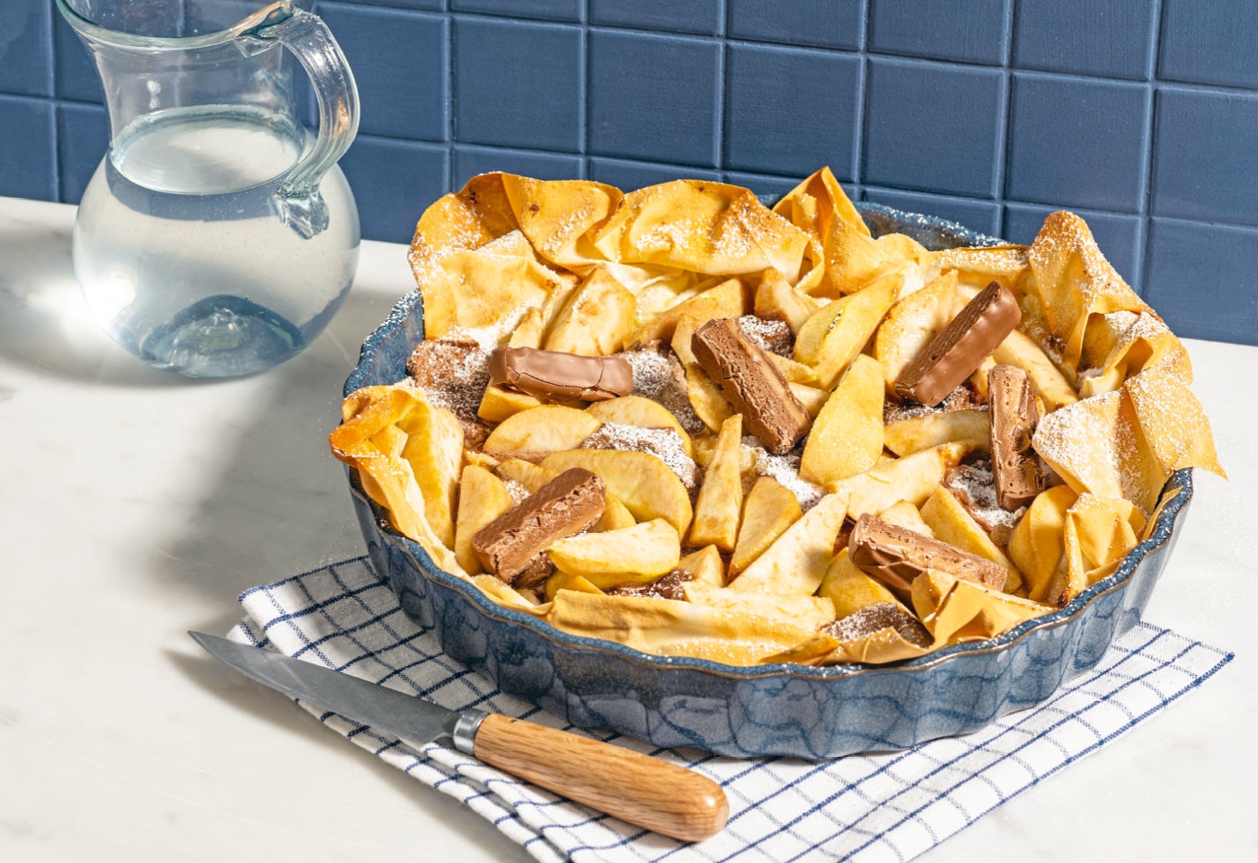 Tarte mit etwas Staubzucker bestreuen und mit den restlichen halbierten Caramel-Minis belegen.