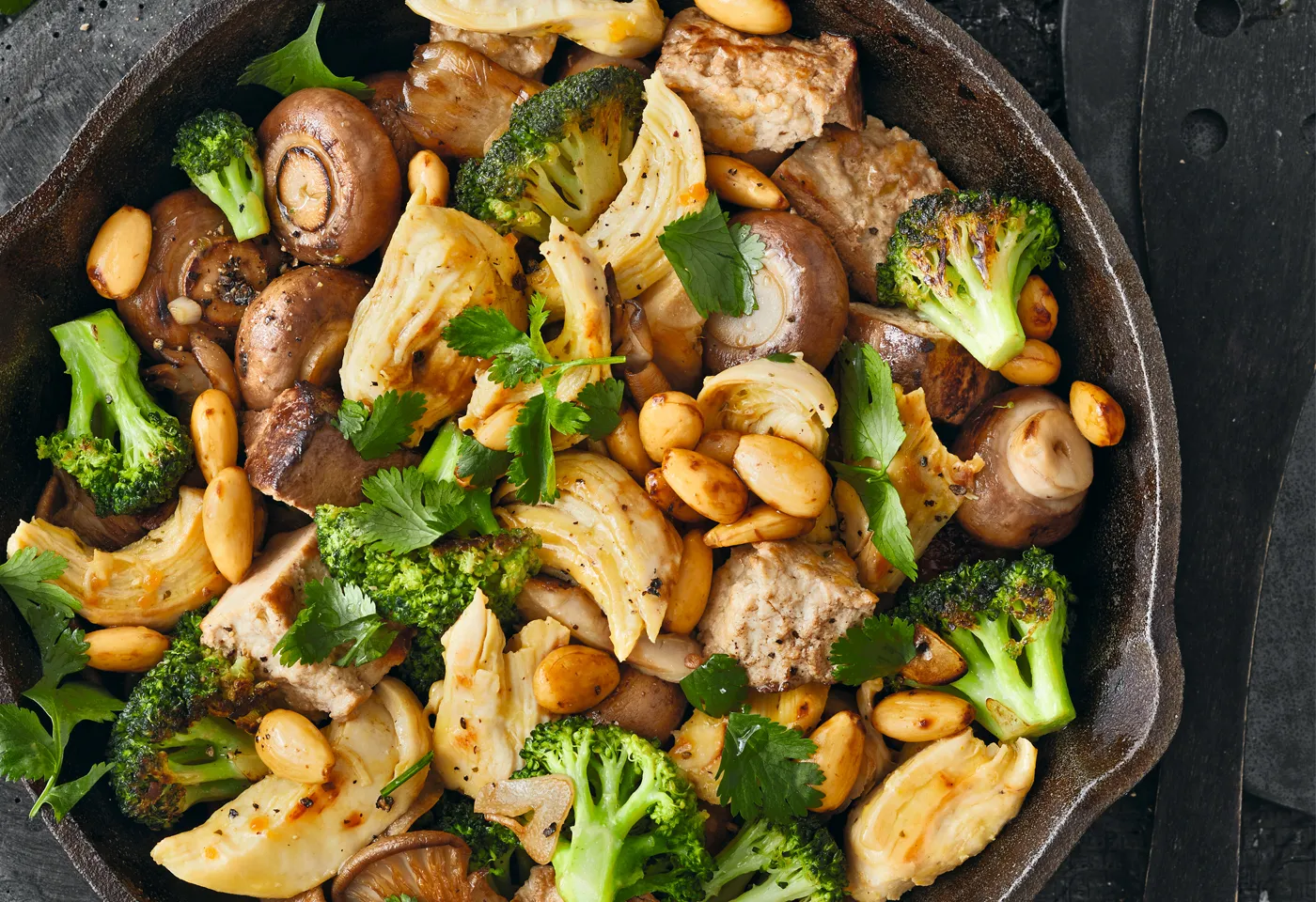 Sesamöl und 30 g Butter in einer großen Pfanne erhitzen und die Pilze darin kräftig anbraten. Knoblauch, Tofu und Brokkoli dazugeben und bei mittlerer Hitze 4 bis 5 Minuten unter mehrmaligem Wenden braten. Hendlfleisch und Mandeln dazugeben und untermischen. Mit Salz und Pfeffer abschmecken und mit grob gezupftem Koriander bestreuen.