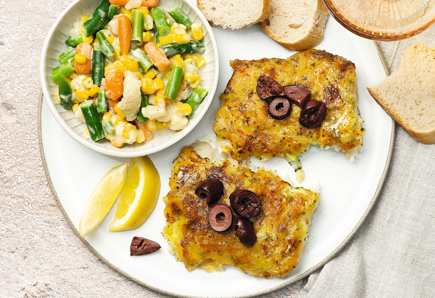 Zutaten für remove add Portion(en)400 gtiefgekühltes Brokkoli-Schlemmerfilet200 gtiefgekühltes gemischtes Cremegemüse3 ELKalamata-Oliven ohne Kern0.25 Baguette2 ZitronenspaltenZubereiten