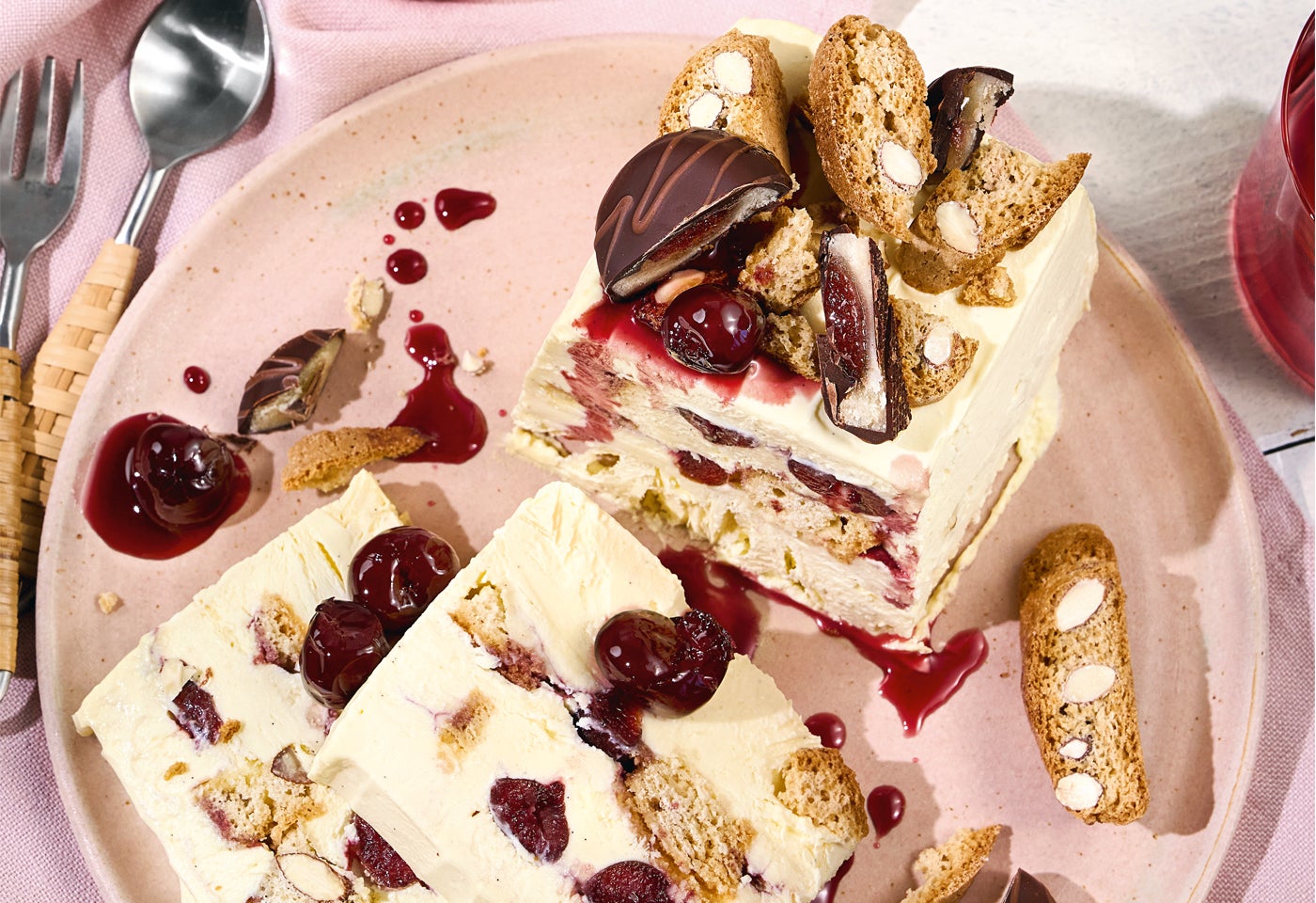 Cantuccini grob zerbröseln und gemeinsam mit den Kirschen vorsichtig unterheben. Eine Kastenform (ca. 10 x 15 cm) mit zwei Lagen Backpapier auskleiden. Masse einfüllen und mind. 4 Std., besser über Nacht tiefkühlen.