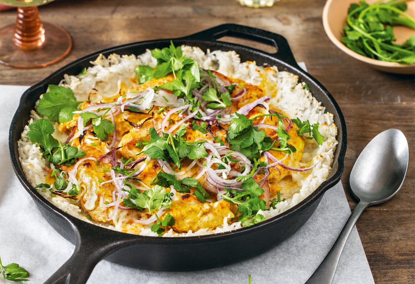 Backrohr auf 180 °C (Ober-/Unterhitze, 160 °C Umluft) vorheizen. Mozzarella zerzupfen. Eine gusseiserne Pfanne (ca. 28 cm ø) mit Öl ausstreichen. Reis in die Pfanne drücken, mit Hendlstreifen belegen und mit etwas Marinade beträufeln. Mozzarella darauflegen und die Pizza auf mittlerer Schiene 20-25 Minuten backen. Mit reichlich Korianderblättern bestreut servieren.