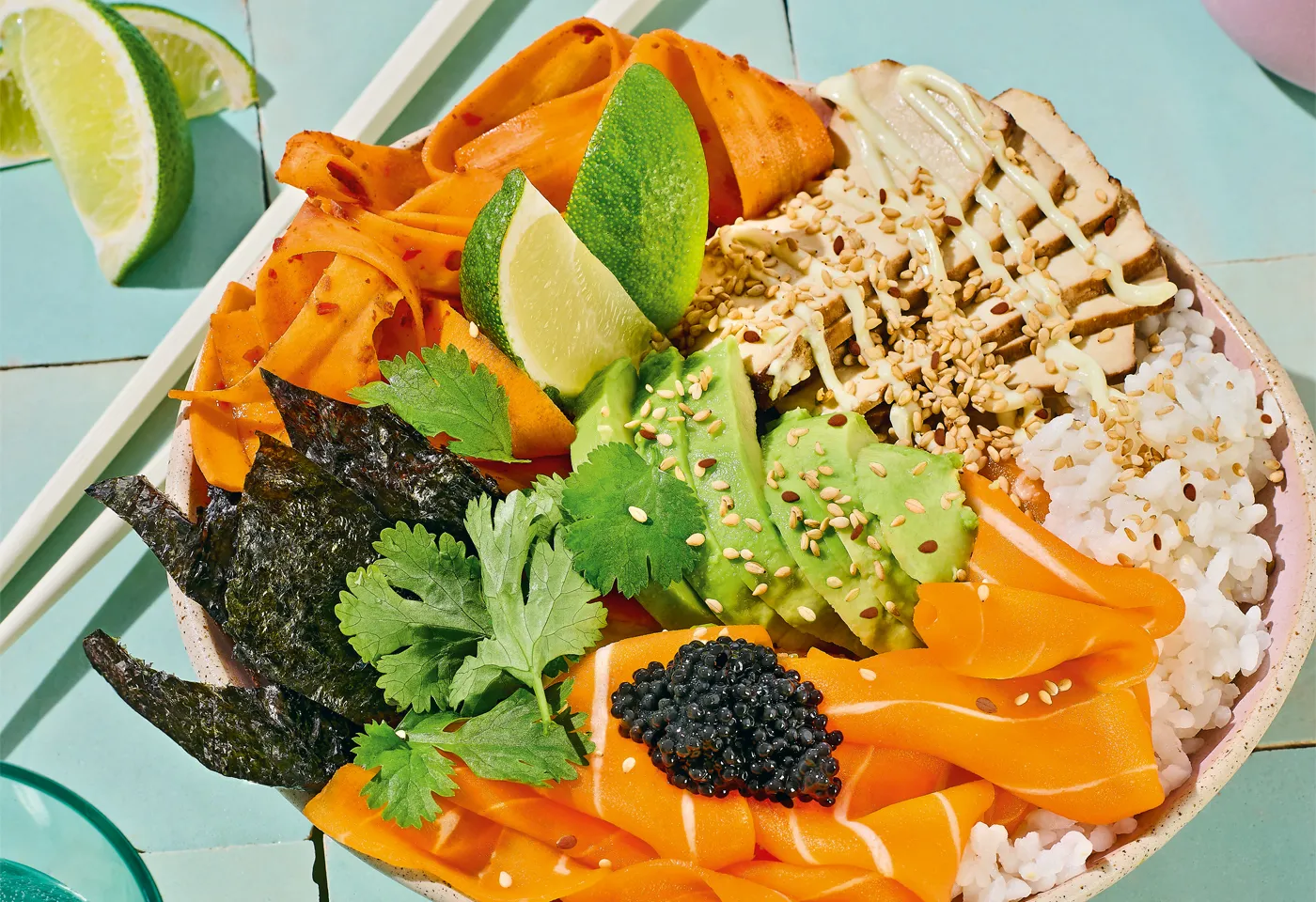 Reis noch warm mit Zucker und Essig marinieren und auf Schüsseln verteilen. Räucherlaxxs, pflanzlichen Kaviar, Tofu, Noriblätter, Karotten, Avocados, Limettenspalten und Koriander darauf anrichten. Tofu mit Wasabi-Mayo garnieren. Bowls mit Sesam bestreuen und mit Sojasauce servieren.