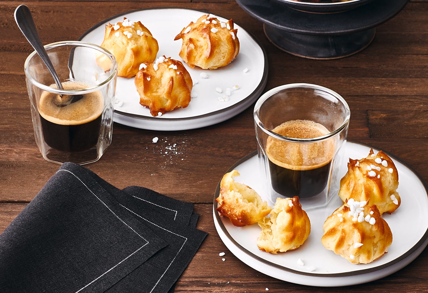 Backrohr auf 220 °C (Ober-/Unterhitze, 200 °C Umluft) vorheizen. Milch, Butter, Salz und Feinkristallzucker in einem Topf aufkochen. Gesamtes Mehl in die heiße Flüssigkeit geben und alles zu einer glatten Teigkugel verrühren, ca. 1 Minute unter ständigem Rühren erhitzen. Teig in eine Rührschüssel geben und mit den Knethaken des Handmixers 1 Ei unterkneten. Die restlichen Eier (4) nacheinander unter den Teig kneten. (Dabei muss jedes Ei einzeln vom Teig aufgenommen werden.)
