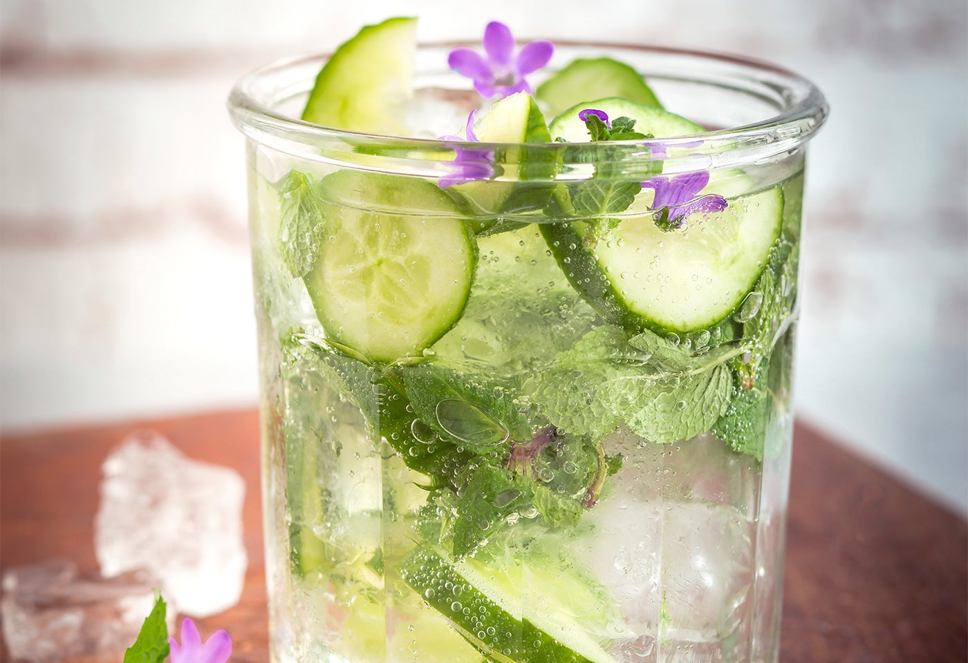 Zutaten für remove add Portion(en)0.5 Salatgurke2 HandvollMinzeblätter1 lprickelndes Mineralwasser Eiswürfel nach Belieben essbare Blüten nach BeliebenZubereiten