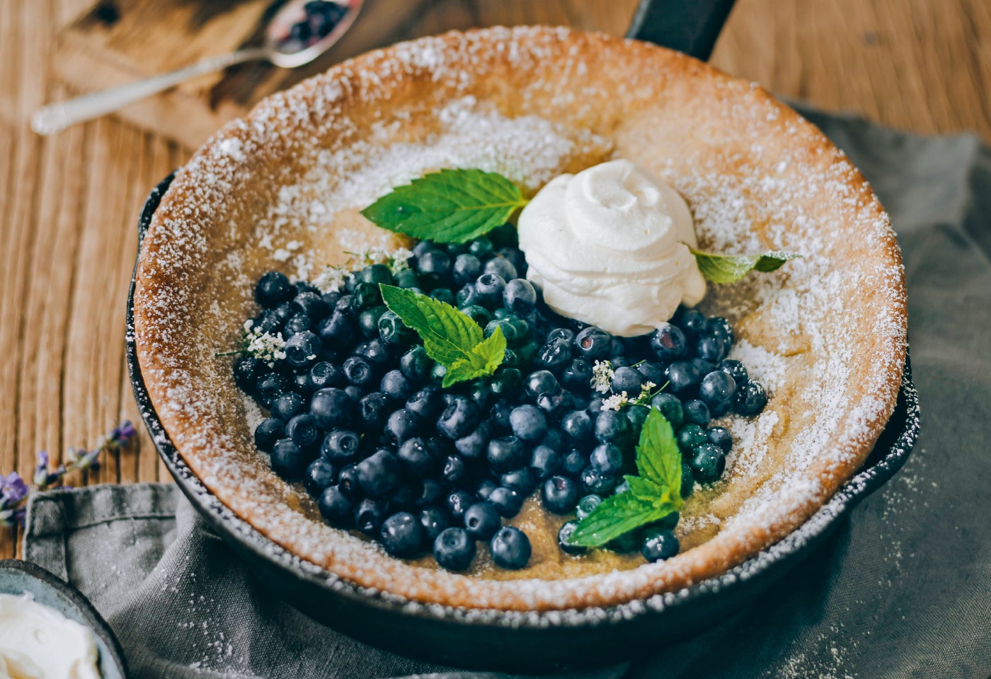 Dutch Baby aus dem Ofen nehmen - der Teig fällt in sich zusammen. Mit Staubzucker bestreuen, Heidelbeeren darauf verteilen und mit Mascarponecreme und Minzblättchen garniert warm servieren.