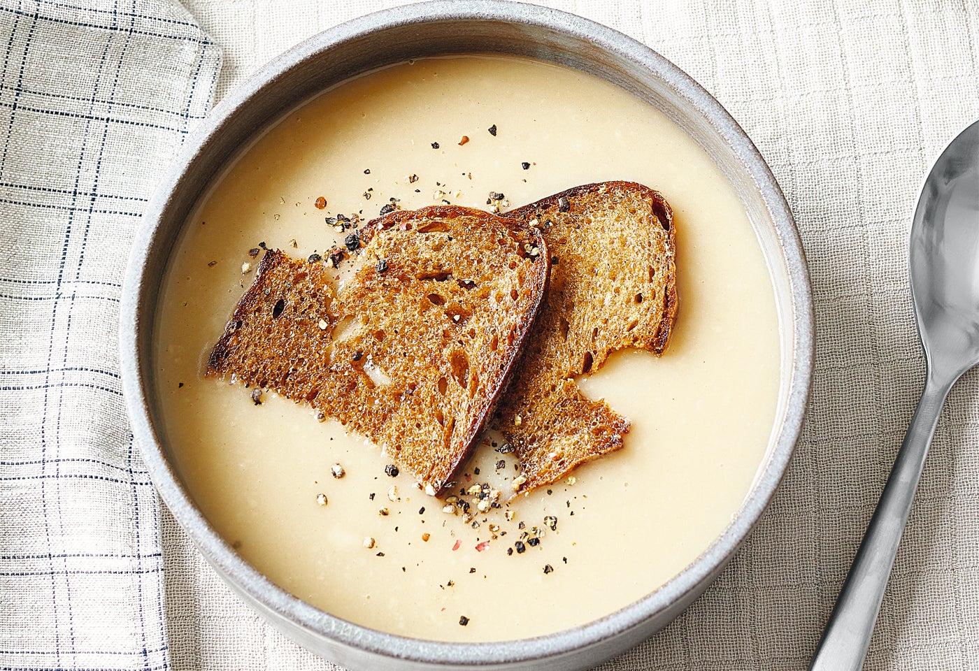 Suppe erneut mit Salz abschmecken, in Suppenschüsseln anrichten, Brotscheiben darauflegen, mit Pfeffer bestreuen und servieren.