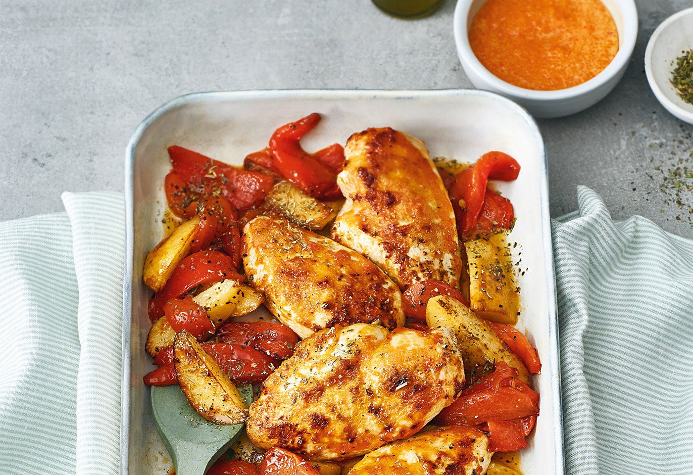 Hühnerfilets mit je 1 EL Paprikasauce überziehen. Erdäpfel und restliche Paprikastücke neben den Filets verteilen und mit dem restlichen Öl (1 EL) beträufeln. Alles mit Majoran, Salz und Pfeffer würzen. Auf mittlerer Schiene ca. 25 Minuten braten, bis Fleisch und Gemüse gar und goldbraun sind.