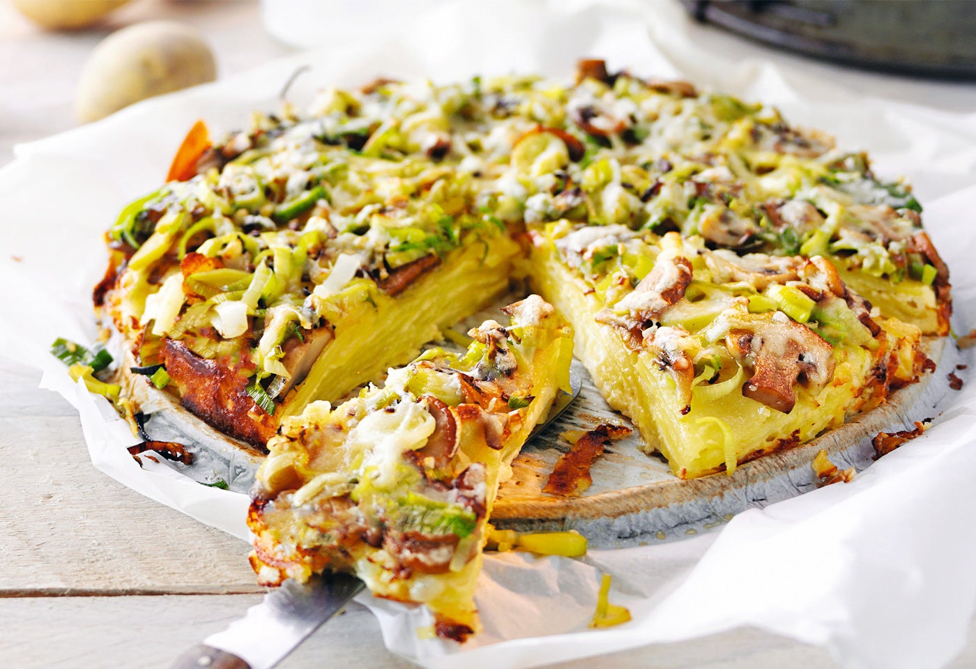 Gratin mit Käse bestreuen, Butterflöckchen darauf verteilen und ca. 40 Min. auf mittlerer Schiene im Backrohr backen. Sollte das Gratin zu dunkel werden, die restliche Backzeit mit Alufolie abdecken. Kurz abkühlen lassen, Springform öffnen, in Tortenstücke schneiden und warm servieren.