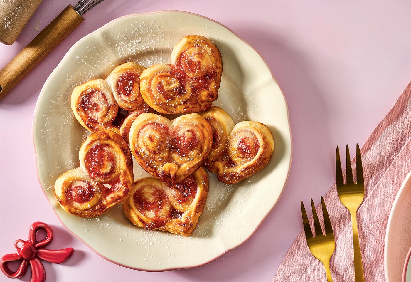 Backe die gefüllten Teigherzen 12 bis 14 Minuten auf der mittleren Schiene goldbraun.
