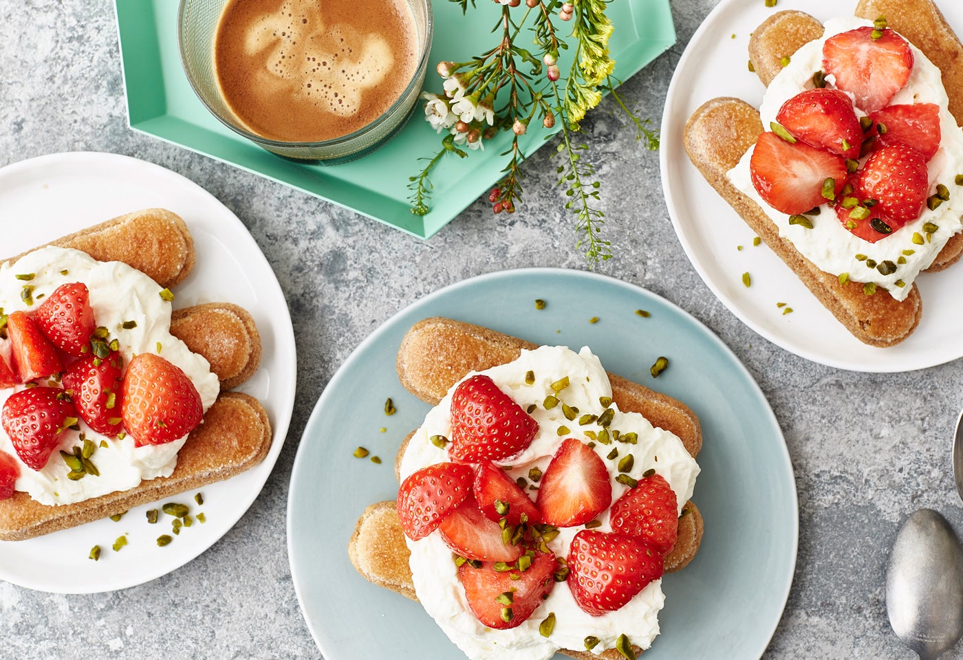 Espresso und Amaretto in einem tiefen Teller vermischen. Biskotten im Kaffee wenden und auf Tellern anrichten und Mascarpone-Creme darauf verteilen. Das Erdbeer-Tiramisu mit Erdbeeren und Pistazien garnieren.