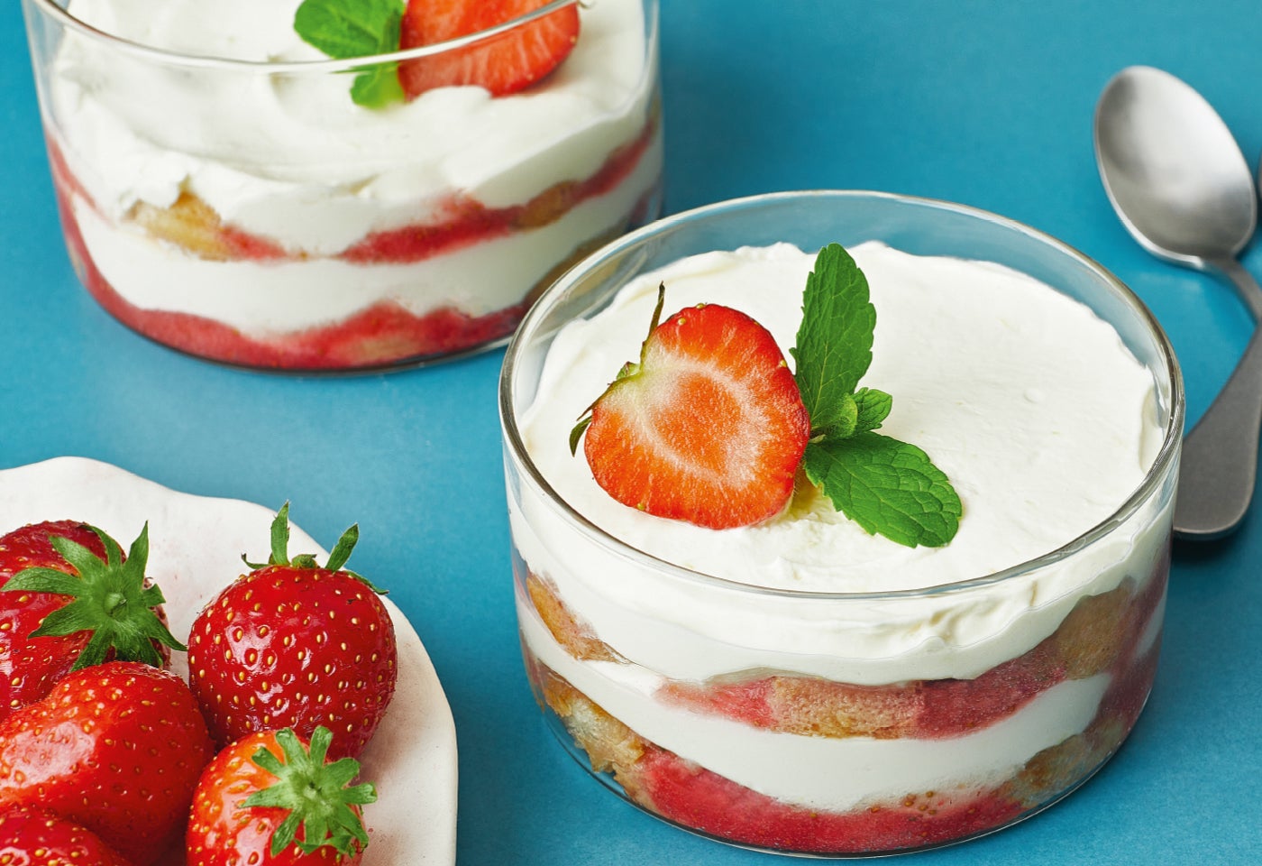Beiseitegelegte Erdbeeren halbieren. Tiramisu mit Erdbeeren und Minze garnieren.