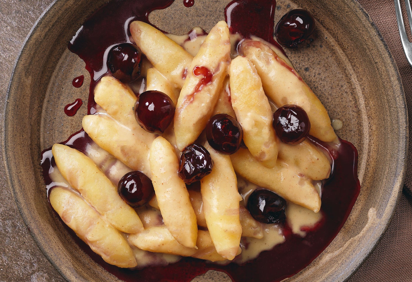 Zutaten für remove add Portion(en)500 gSchupfnudeln3 ELErdnusscreme ohne Stücke100 mlSchlagobers2.5 Ahornsirup (Grad C)3.5 Amarenakirschen SalzZubereiten