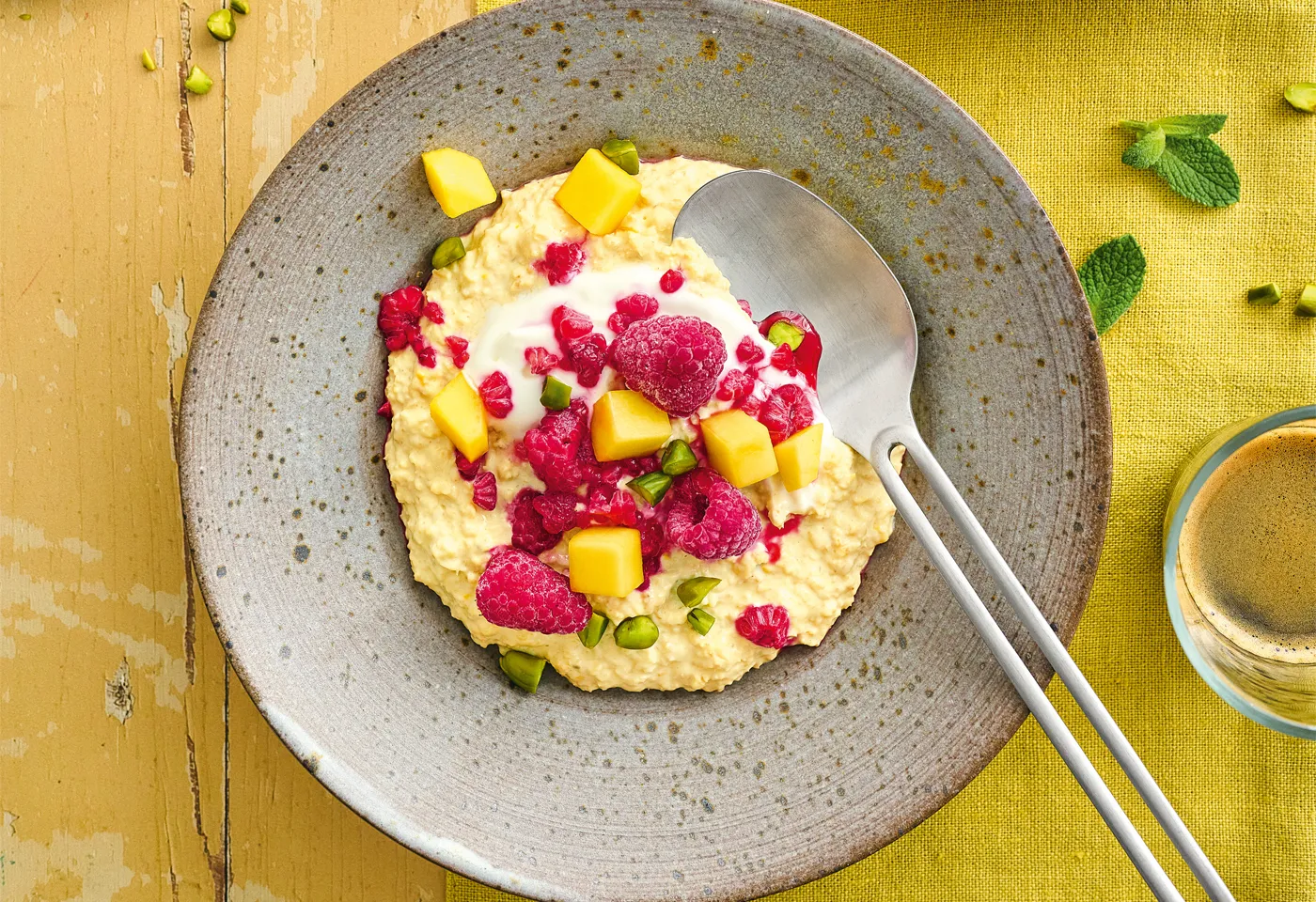 - accessibility.recipes.cookingstepMango schälen und würfeln. Pistazien grob hacken. Himbeeren grob zerdrücken. Overnight-Oats in Schüsseln füllen. 100 g Joghurt darauf verteilen und mit Mango, Himbeeren, Pistazien und Minze garnieren.
