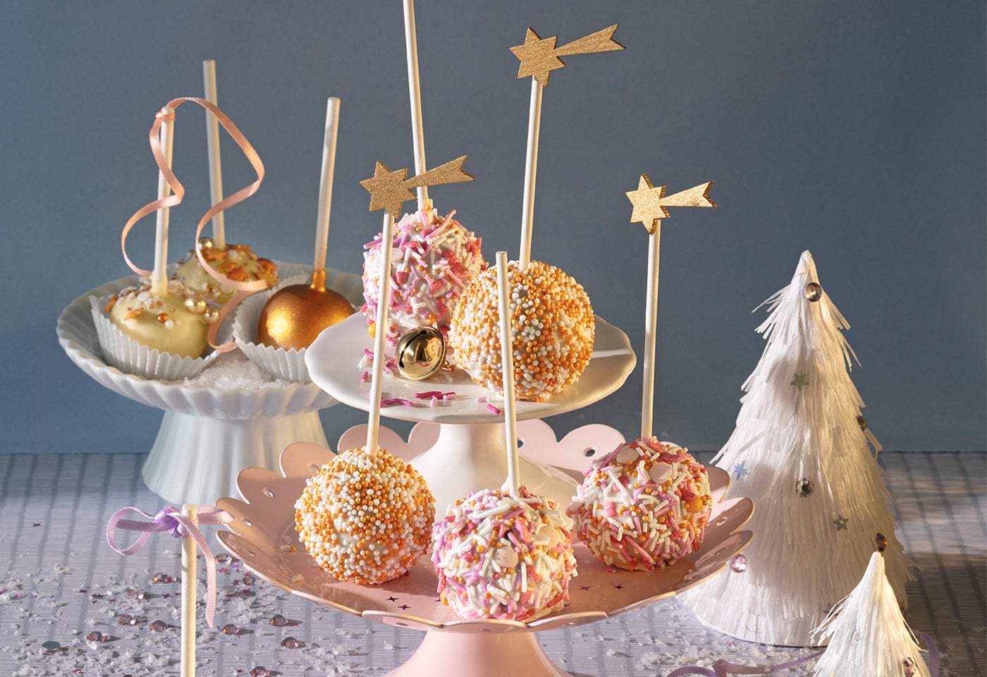 - rosa und goldene Zuckerstreusel, z. B. Dr. Oetker Perlen Mix oder Dr. Oetker Roségold Mix