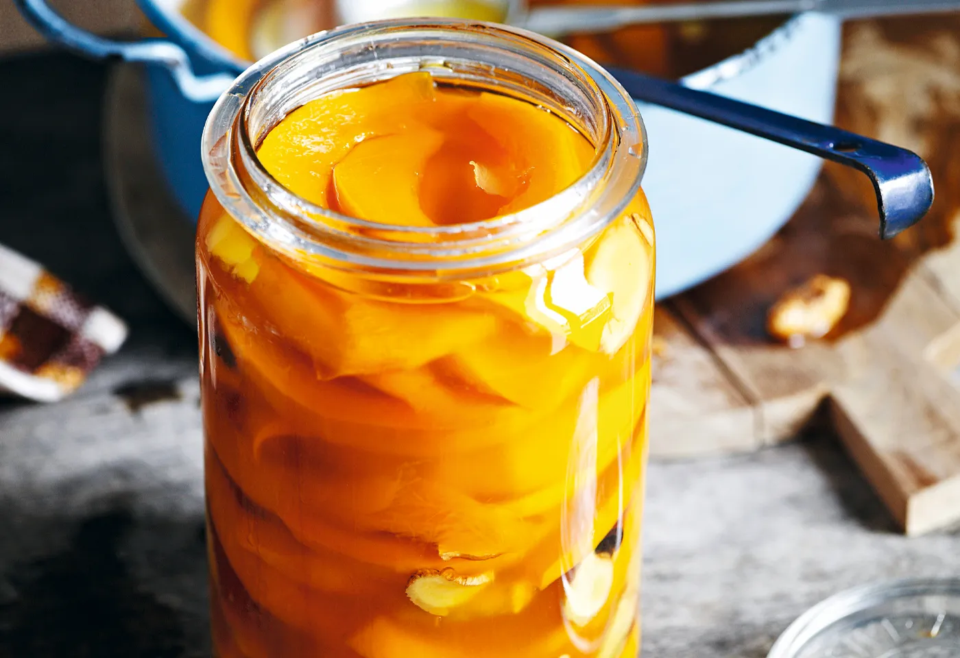 Kürbis in die vorbereiteten Einmachgläser füllen, mit dem Sud bedecken und mit Einmachgummi und Deckel verschließen. Ca. 20 Minuten bei 85 °C im Einmachtopf einkochen. Dabei am besten auf eine Drahtunterlage stellen.