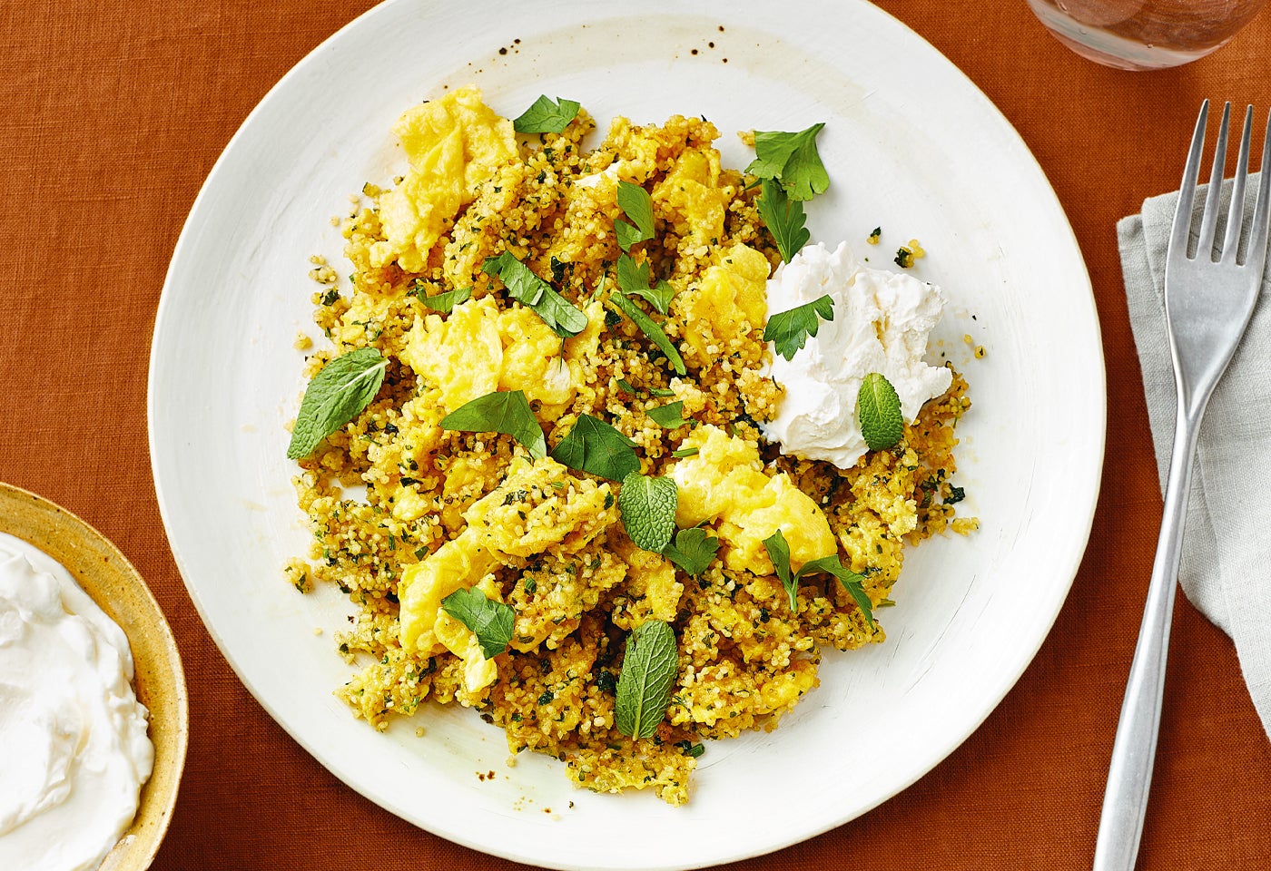 Taboulé mit Labneh anrichten und mit Kräutern bestreuen.