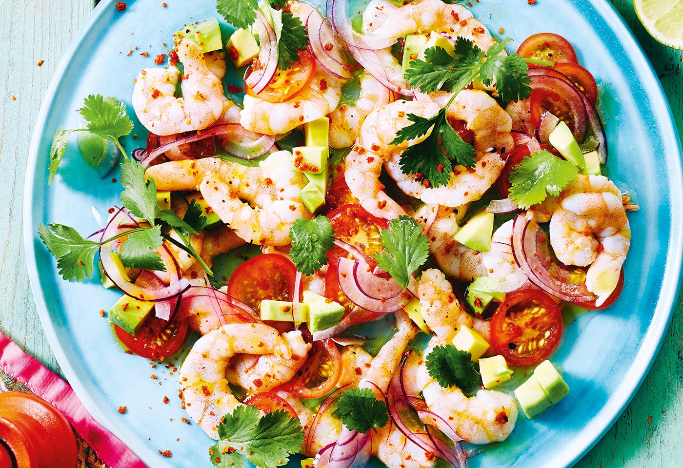 Garnelen auf Teller legen, Tomaten, Zwiebel, Avocado und Koriander darauf verteilen, mit dem restlichen Zitrussaft und dem Öl beträufeln und mit Salz und Chiliflocken bestreuen. Ca. 5 Minuten ziehen lassen und servieren.