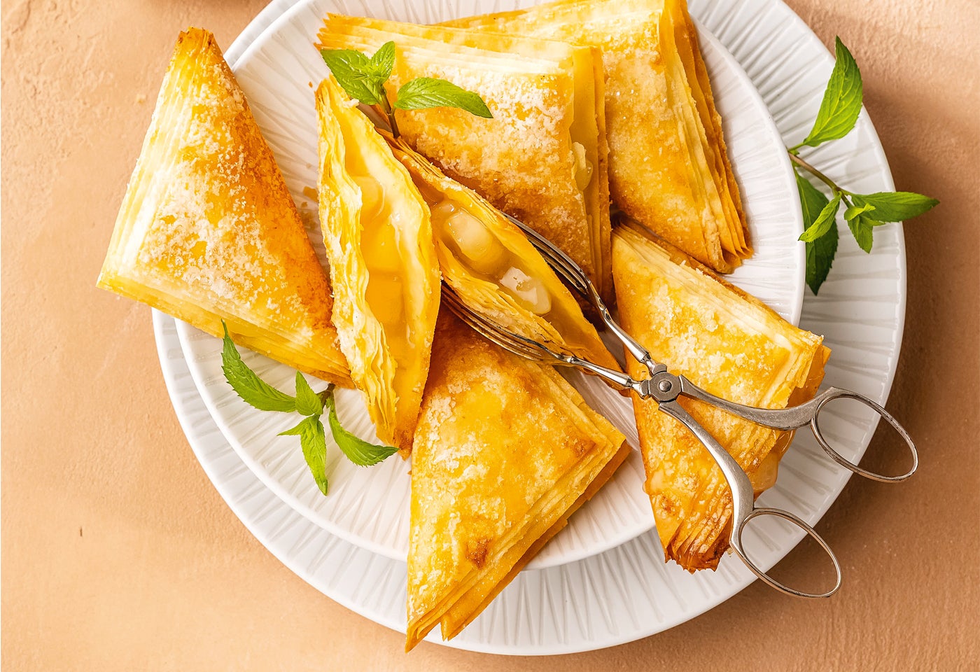 Die Taschen auf einer Platte anrichten und den Labneh dazu reichen. Wer will, kann den Labneh auch in einen Spritzbeutel mit Lochtülle füllen und jeweils etwas auf jede Tasche spritzen. Mit frischen Minzblättern garnieren.