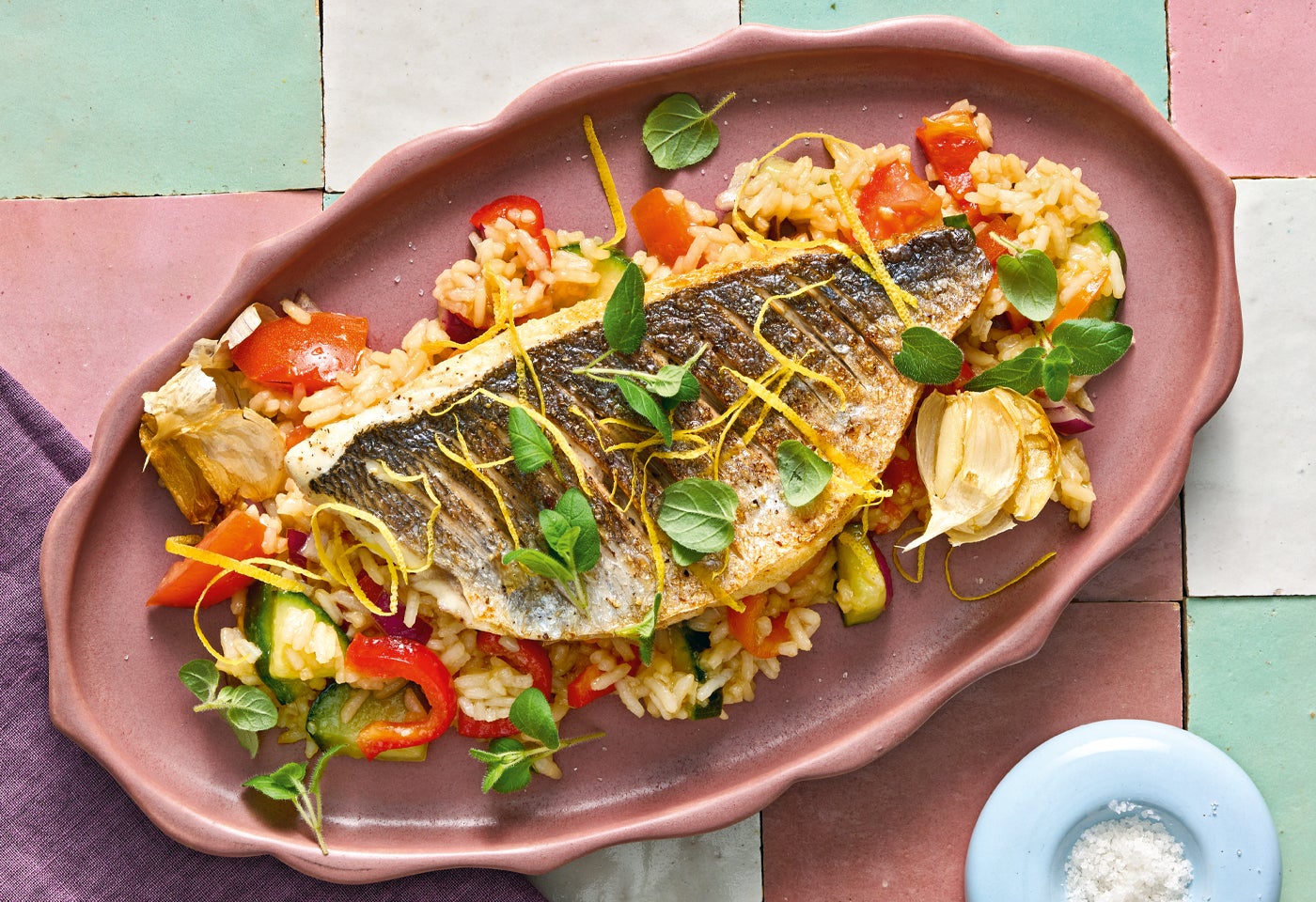 Gebratene Goldbrasse mit Gemüse-Reis-Salat