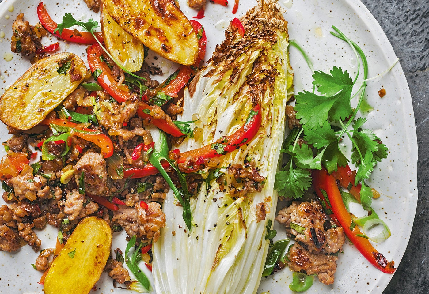 Währenddessen Jungzwiebeln, Paprika und Chili putzen und fein schneiden. 2 Handvoll Koriander fein hacken. Chinakohl putzen, der Länge nach vierteln, mit 2 EL Öl bestreichen und salzen. In einer heißen Pfanne ca. 10 Minuten goldbraun braten. Faschiertes in 2 EL Öl kräftig anbraten, herausnehmen, Jungzwiebeln, Paprika und Chili im restlichen Öl (1 EL) anbraten, Faschiertes und gehackten Koriander dazugeben und abschmecken.