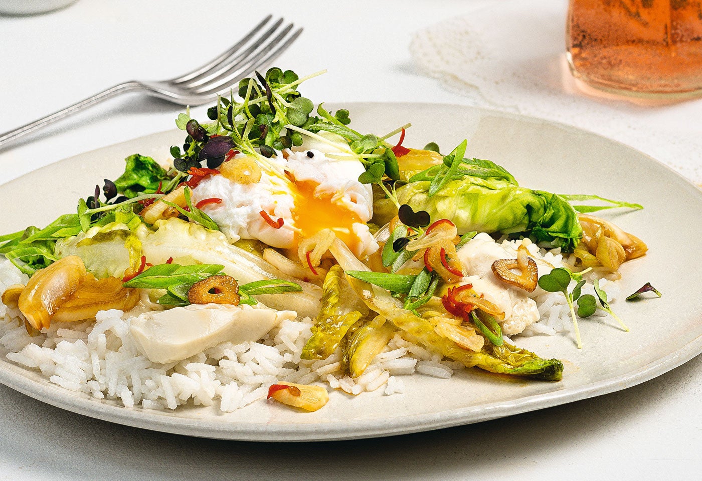 Reis und gebratenem Salat auf Teller verteilen. Seidentofu mit einem Löffel daraufsetzen. Eier mit einem Siebschöpfer vorsichtig aus dem Wasser heben, kurz abtropfen lassen und auf dem Salat anrichten. Mit geröstetem Knoblauch, Jungzwiebelgrün und Sprossen bestreuen.