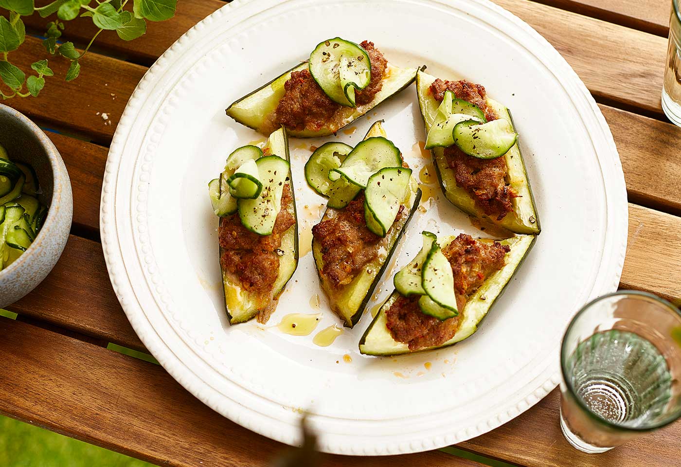 Die Gurkenstücke mit Faschiertem füllen und Gurken für 20 Minuten im Backrohr rösten.