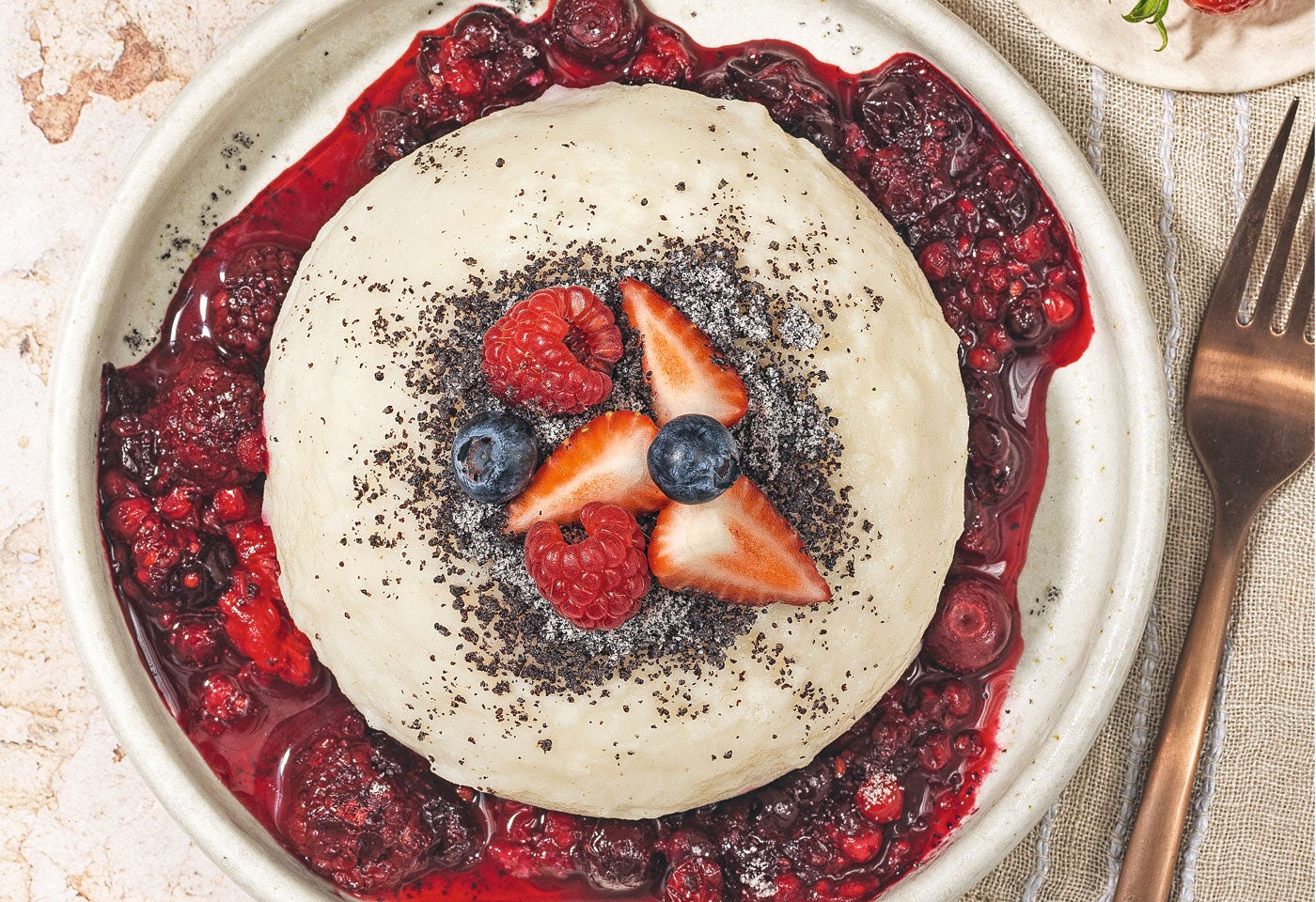 Germknödel auf Beerenröster anrichten, mit etwas Mohn-Zucker-Mischung aus der Packung bestreuen und mit frischen Beeren garnieren.
