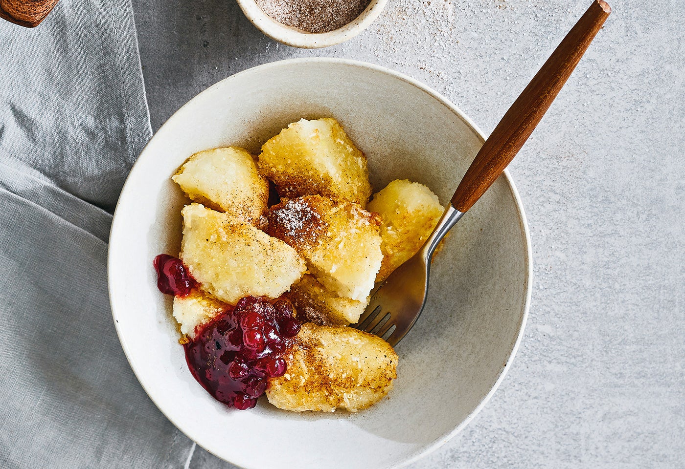 Knödel mit Preiselbeeren anrichten, mit Zimtzucker bestreuen und servieren.