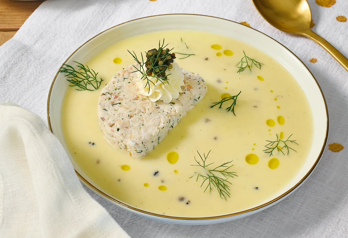 Getrüffelte Erdäpfelsuppe mit Räucherforelle und Kaviar-Blinis