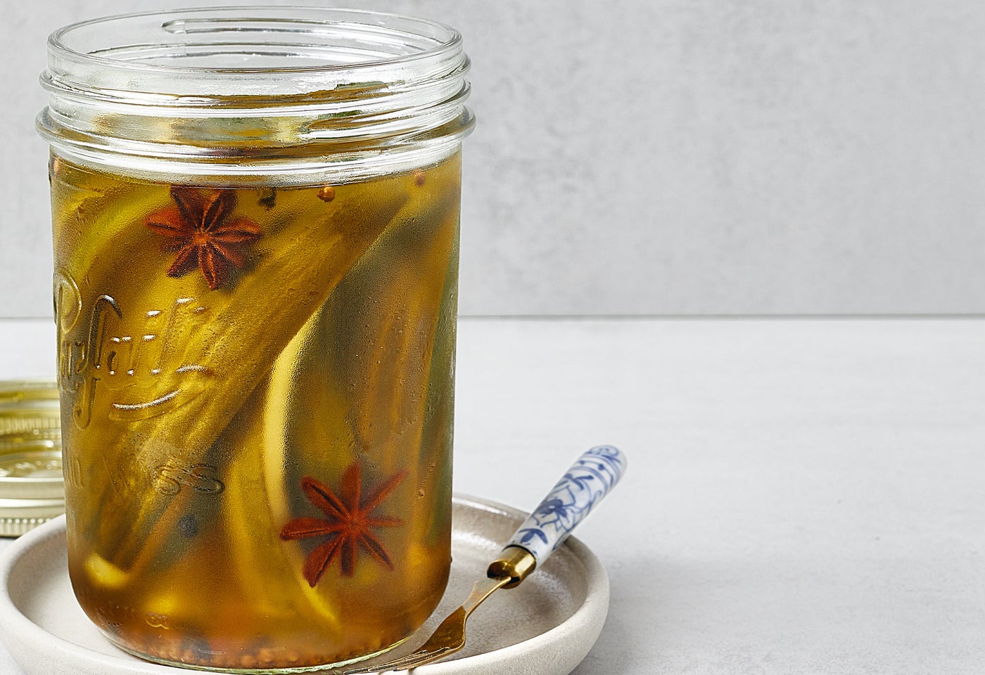 - accessibility.recipes.cookingstepGurke in längliche Stifte schneiden und in ein ausreichend großes sterilisiertes Einmachglas füllen. Sternanis, Pfeffer und Koriander dazugeben.