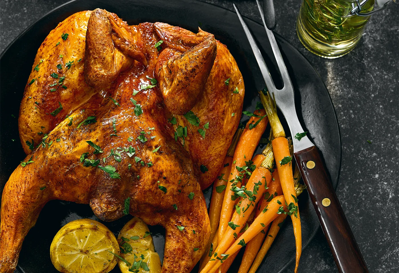 Glasiertes Butterfly-Hendl mit Joghurt-Erdäpfelsalat und Folienkarotten